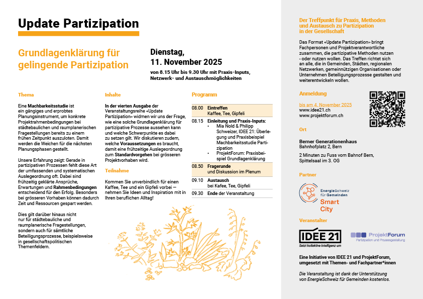 Udpate Partizipation ist eine Initiative von IDEE 21 und ProjektForum, in Kooperation mit Themen- und Fachpartner*innen